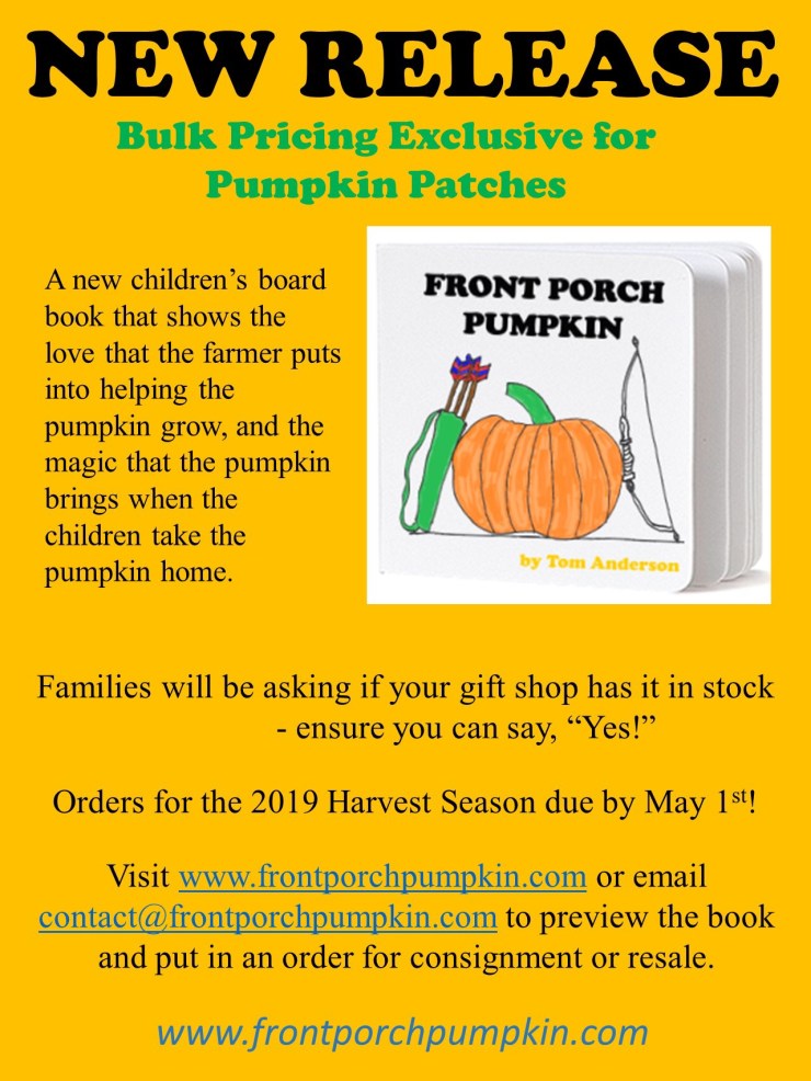 Are you a Pumpkin Patch owner? If so, let us know below how many copies of Front Porch Pumpkin you would like us to order for delivery to your Pumpkin Patch for this Fall’s Pumpkin Patch season. Front Porch Pumpkin has a suggested retail price of $9.99, and Pumpkin Patch owners can bulk order the book for resale at only $5 per copy (shipping included). That’s a 50% profit! Pumpkin Patch owners may also order Front Porch Pumpkin for consignment, with no money down including shipping, and Pumpkin Patch owners will take home 25% of the consignment sale price of $9.99. Bulk orders can be requested in multiples of 60 books (60 book minimum). Sales orders over 300 books receive further price discounts. No money due now!